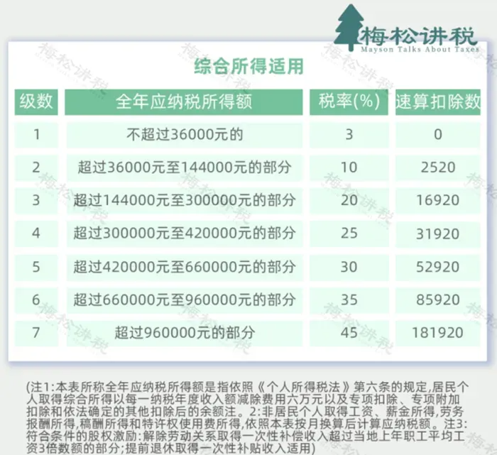 1、居民个人取得全年一次性奖金,符合《国家税务总局关于调整个人取得全年一次性奖金等计算征收个人所得税方法问题的通知》(国税发〔2005〕9号)规定的,不并入当年综合所得,以全年一次性奖金收入除以12个月得到的数额,按照本公告所附按月换算后的综合所得税率表,确定适用税率和速算扣除数,单独计算纳税。